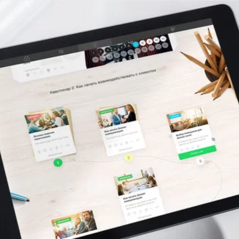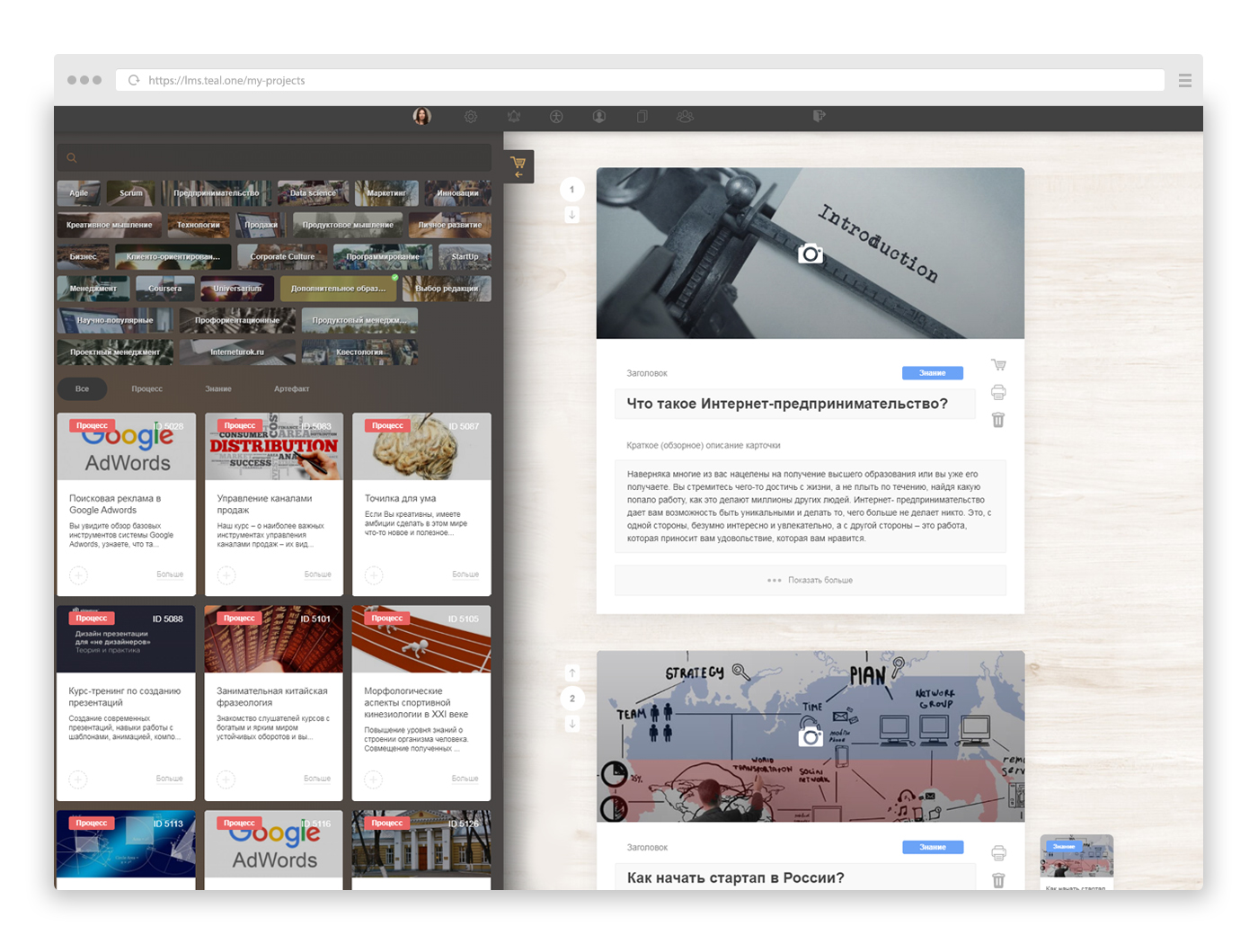 Контент разбивается на смысловые карточки, что позволяет структурировать образовательный процесс, быстро настраивать образовательную траекторию и повышать эффективность обучения. Мгновенное создание курсов.